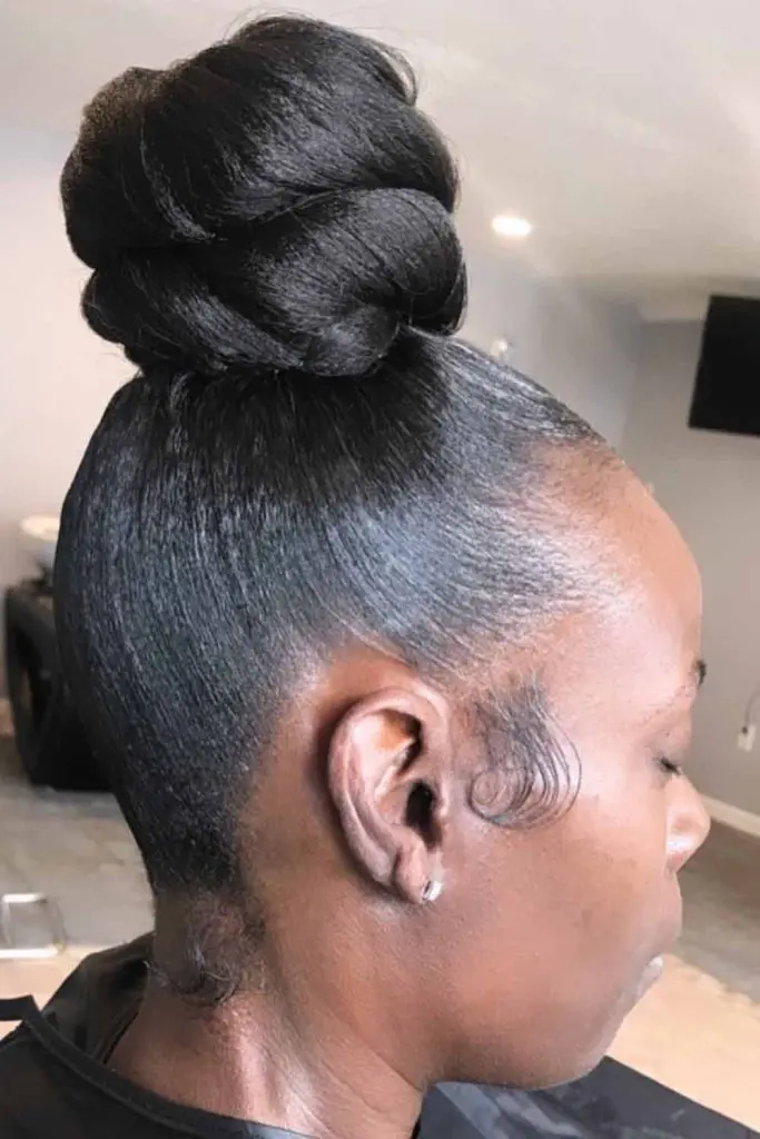 This hairstyle features a sleek, high bun with a twisted design, creating a sophisticated and polished look. The hair is smoothly pulled back and secured into a large, intricately twisted bun on top of the head. This style is perfect for formal events, weddings, or professional settings, offering a timeless and elegant appearance. The smooth finish and structured shape make it stand out, providing a chic and refined look suitable for various occasions.