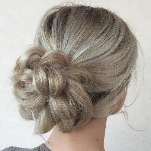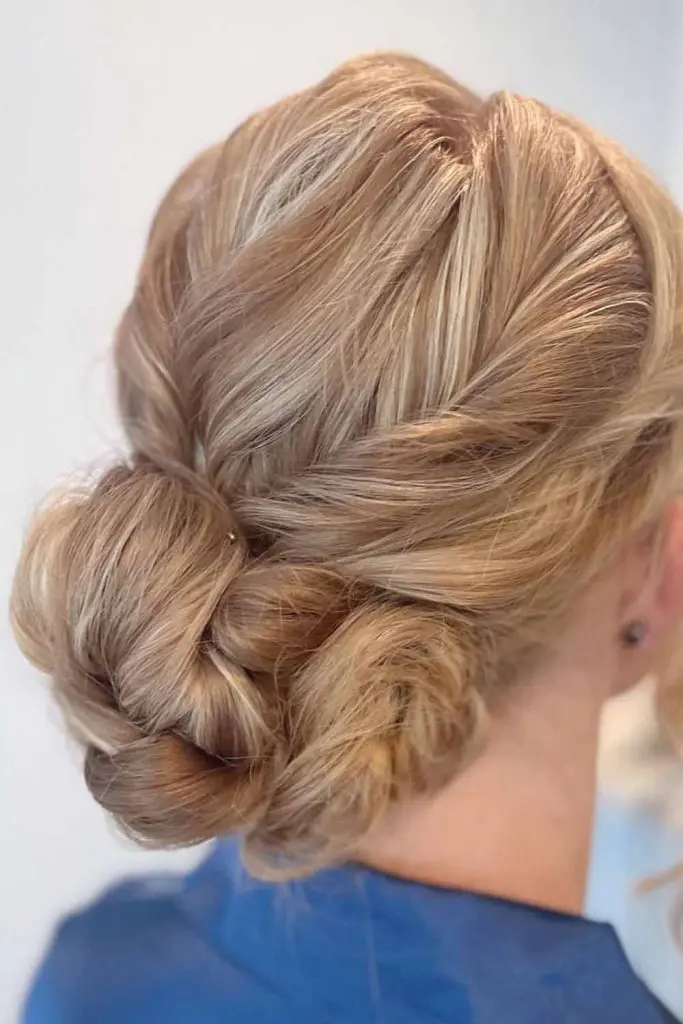 This hairstyle features a sophisticated low bun created by twisting sections of long, blonde hair. The intricate twists add texture and volume, making it perfect for formal events like weddings or elegant dinners. The style is both timeless and versatile, suitable for various hair types and lengths. Its polished look ensures it stays in place throughout the day or night, adding a touch of grace to any outfit.