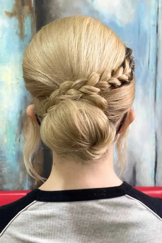 This hairstyle features a sleek, low bun complemented by a delicate braid that wraps around the head, adding texture and elegance. The hairstyle is perfect for formal events, weddings, or professional settings, offering a polished and refined look. The smooth finish and intricate braid make it stand out, while the low bun keeps it classic and timeless.
