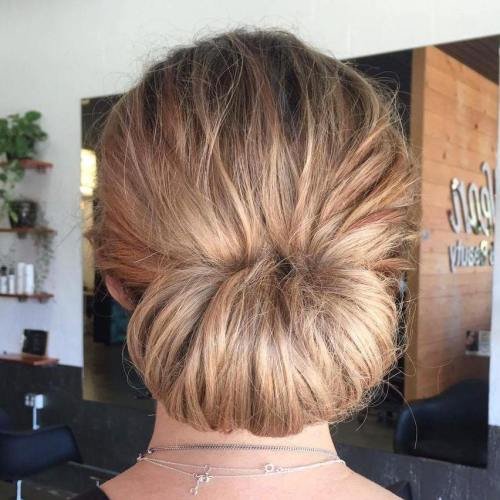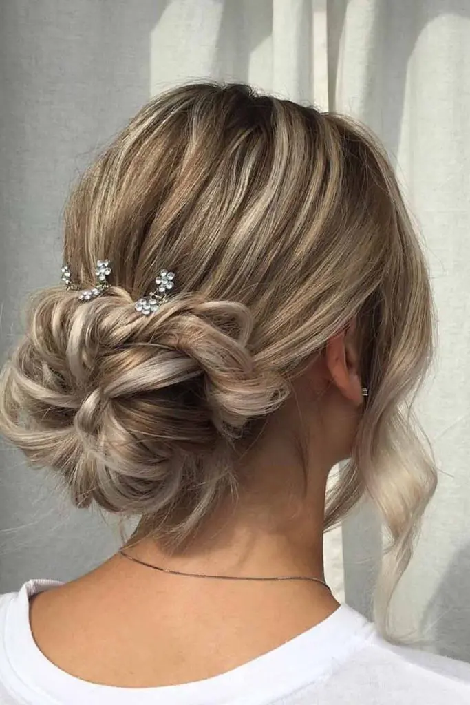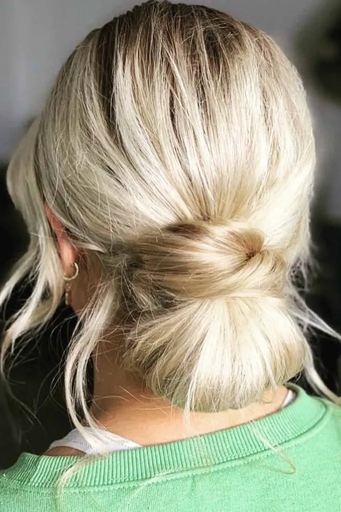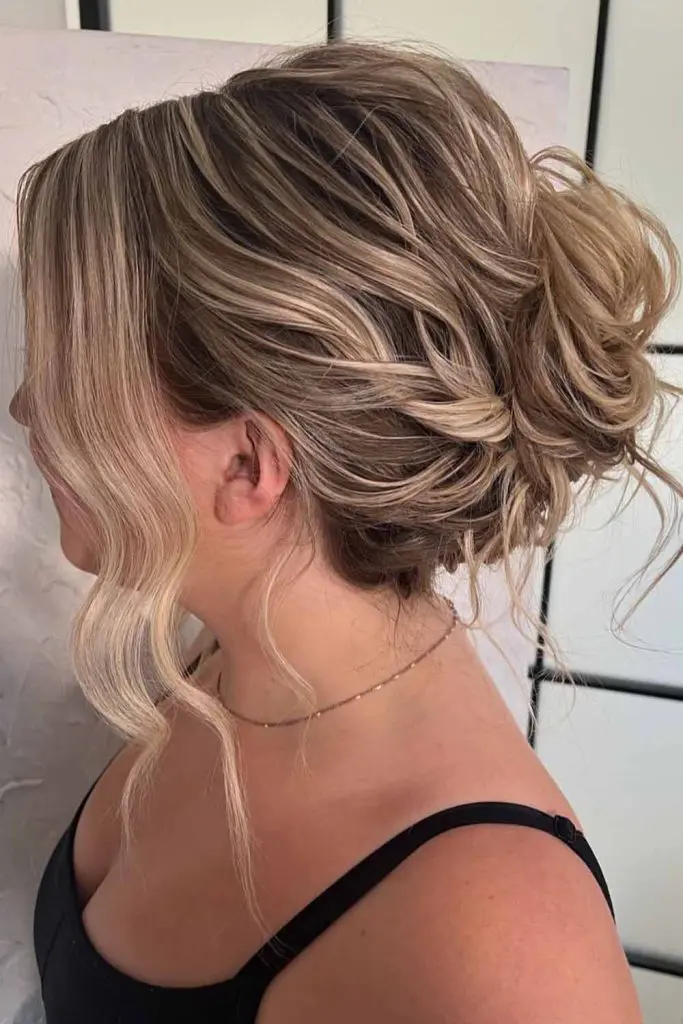 This elegant low bun is a timeless updo that exudes effortless sophistication. The hair is softly gathered and twisted at the nape, creating a voluminous and slightly undone look. The warm blonde tones add dimension, while the subtle texture gives it a romantic touch. Perfect for weddings, formal events, or even a polished everyday style, this hairstyle is versatile and suits various hair types. Its relaxed yet refined appearance makes it an ideal choice for those who love a classy yet modern look.