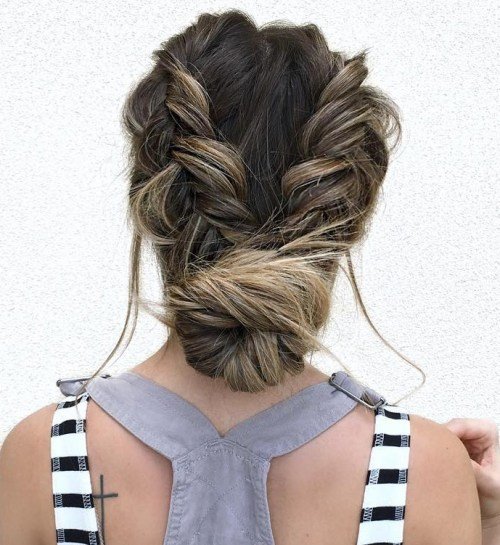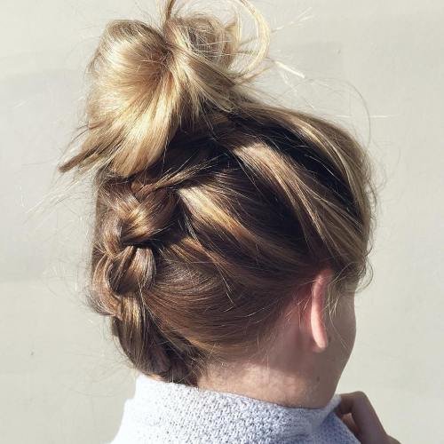 This stylish updo features an upside-down French braid leading into a playful, messy bun. The mix of warm blonde and caramel tones adds dimension, while loose strands give it a relaxed, effortless feel. Perfect for casual outings, workouts, or even a chic night out, this hairstyle combines elegance with a carefree vibe. It’s a great choice for those who want a unique, eye-catching look without too much effort.