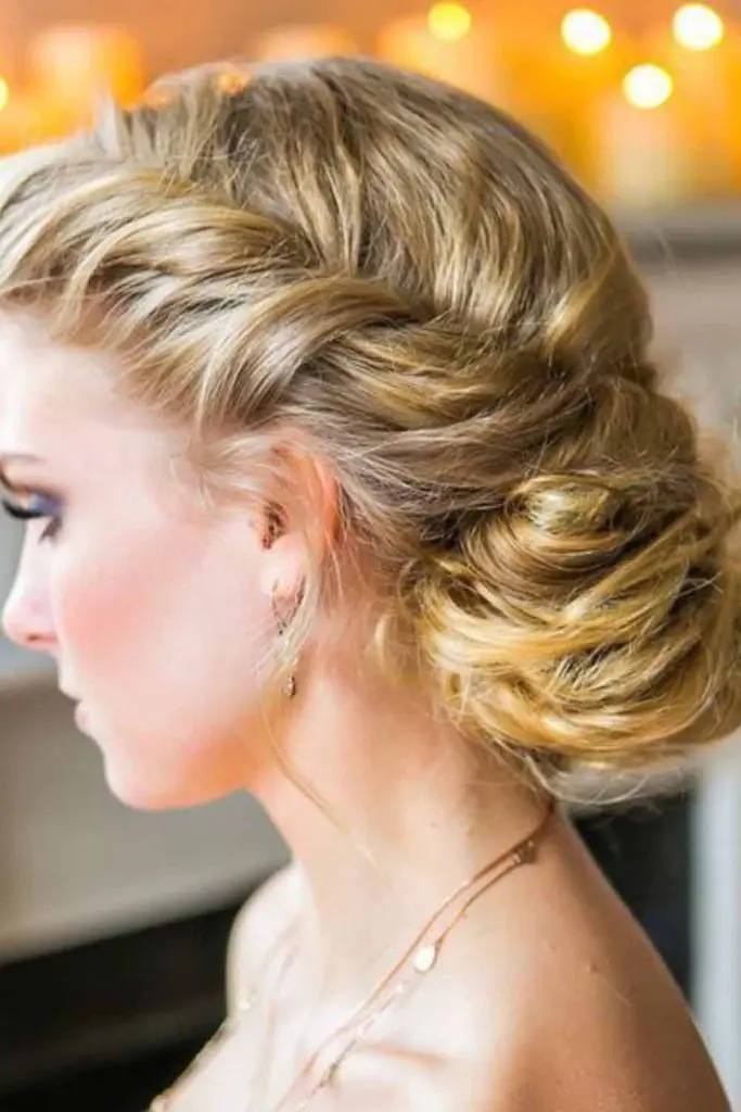 This hairstyle features a sophisticated low bun with intricate twists and soft waves, creating a voluminous and textured look. The hair is elegantly swept back and secured at the nape of the neck, making it perfect for formal events like weddings, proms, or elegant dinners. The soft, romantic waves add a touch of femininity and grace, making it suitable for various face shapes and hair types.