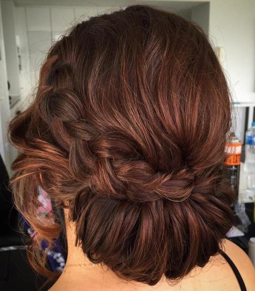 This romantic updo features a softly woven braid that cascades into a voluminous low bun. The warm chestnut brown color, enhanced with subtle highlights, adds richness and depth to the look. Loose curls frame the face, giving a soft, effortless feel. This hairstyle is perfect for weddings, proms, or any formal occasion, balancing elegance with a touch of boho charm. Its intricate details make it stand out, while its relaxed structure ensures a natural and graceful finish.