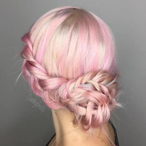 This stunning updo features soft pastel pink hues woven into an intricate side braid that flows into a delicate low bun. The combination of braiding and gentle twists adds texture and elegance, making this hairstyle both playful and sophisticated. The pastel tones give it a dreamy, fairytale-like vibe, perfect for weddings, proms, or artistic events. This style works beautifully for those who love a romantic, feminine look with a modern twist. Whether paired with a formal gown or a chic casual outfit, it effortlessly stands out.