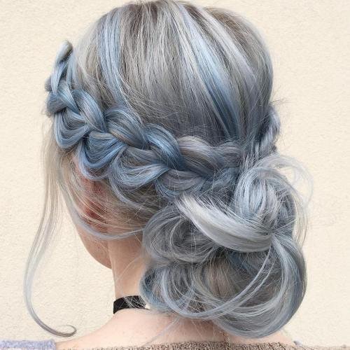 This stunning updo features a loose, voluminous low bun with a beautifully woven side braid, adding elegance and charm. The cool-toned silver and icy blue hues create a unique and ethereal effect, making this hairstyle perfect for those who love a bold yet sophisticated look. The soft, wispy strands frame the face, enhancing its romantic appeal. Ideal for weddings, winter-themed events, or artistic photoshoots, this updo blends creativity with classic beauty. It’s a dreamy choice for anyone looking to make a graceful yet modern statement.