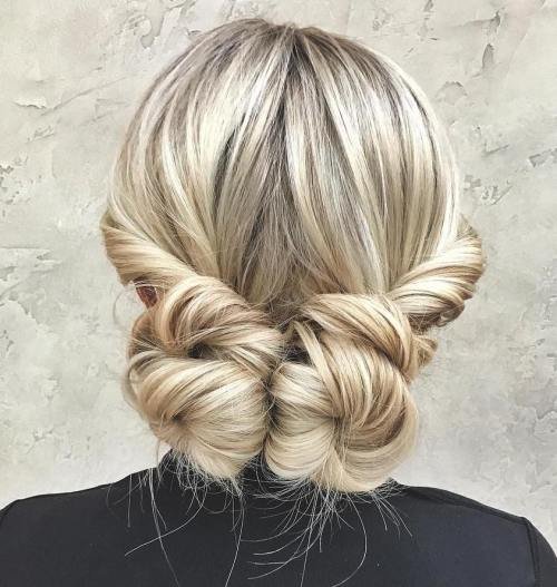 This elegant updo features two beautifully twisted low buns, creating a stylish and symmetrical look. The soft blonde tones with subtle highlights add depth and dimension, making the hairstyle stand out effortlessly. The relaxed texture keeps it modern and chic, perfect for weddings, formal events, or even a sophisticated casual look. This style is ideal for those who want a balance of elegance and creativity while maintaining a soft, romantic feel. Whether for a special occasion or an everyday statement, this updo ensures a timeless and graceful appearance.