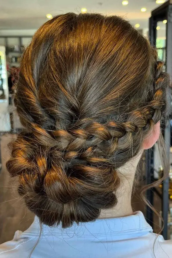 This elegant low bun combines soft waves and delicate twists, creating a relaxed yet sophisticated look. The warm brown tones add depth and dimension, enhancing the natural shine of the hair. Loose tendrils frame the face, giving the hairstyle a romantic and effortless feel. This versatile updo is perfect for weddings, formal dinners, or casual chic events. It pairs beautifully with dresses and off-the-shoulder tops, making it a go-to choice for a timeless and graceful appearance.